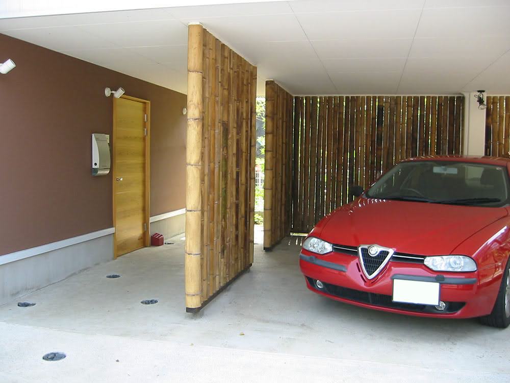 孟宗竹の産地として有名な宇都宮市、若山牧場の竹で作ったルーバーが力強い、野趣に富むピロティ型ガレージ。年月とともに飴色に変化する孟宗竹がシンプルなガレージのアクセントに。