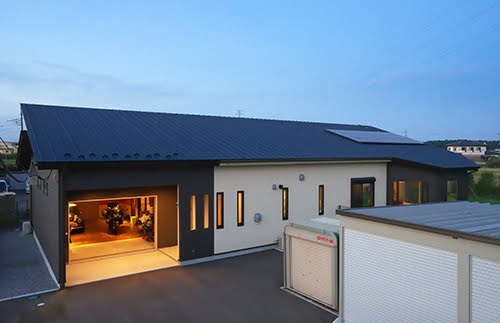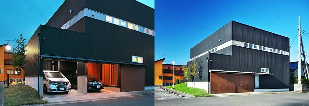 愛車の整備スペースとしてリフトのあるガレージハウスと住宅、二つの建物を1つの敷地の中に組み込んでいます。