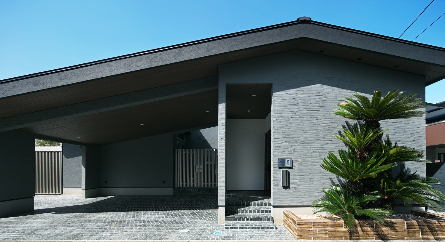屋根と構造上必要な壁面を残して壁面をオープンにしたピロティ型のガレージは、玄関アプローチとつながり、Door-to- Door 0秒で雨が降っても傘不要。建物右側には2台めの駐車スペースも確保しています。