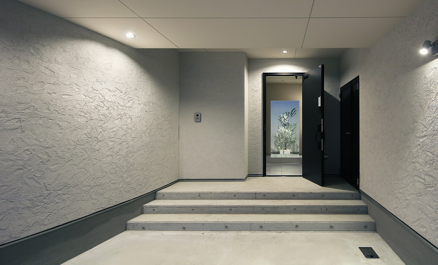 左官仕上げの美しいR壁を通り玄関ドアを開けると、中庭のシンボルツリーが出迎える、陰影の美しいアプローチ兼用ガレージ。