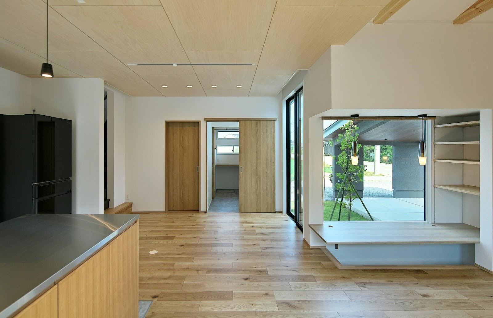 平屋部分の屋根を延伸して構成したアプローチを兼ねたビルトインガレージ。LDKに設けた掘り炬燵スタイルの食卓から、いつでも庭と愛車が楽しめます。