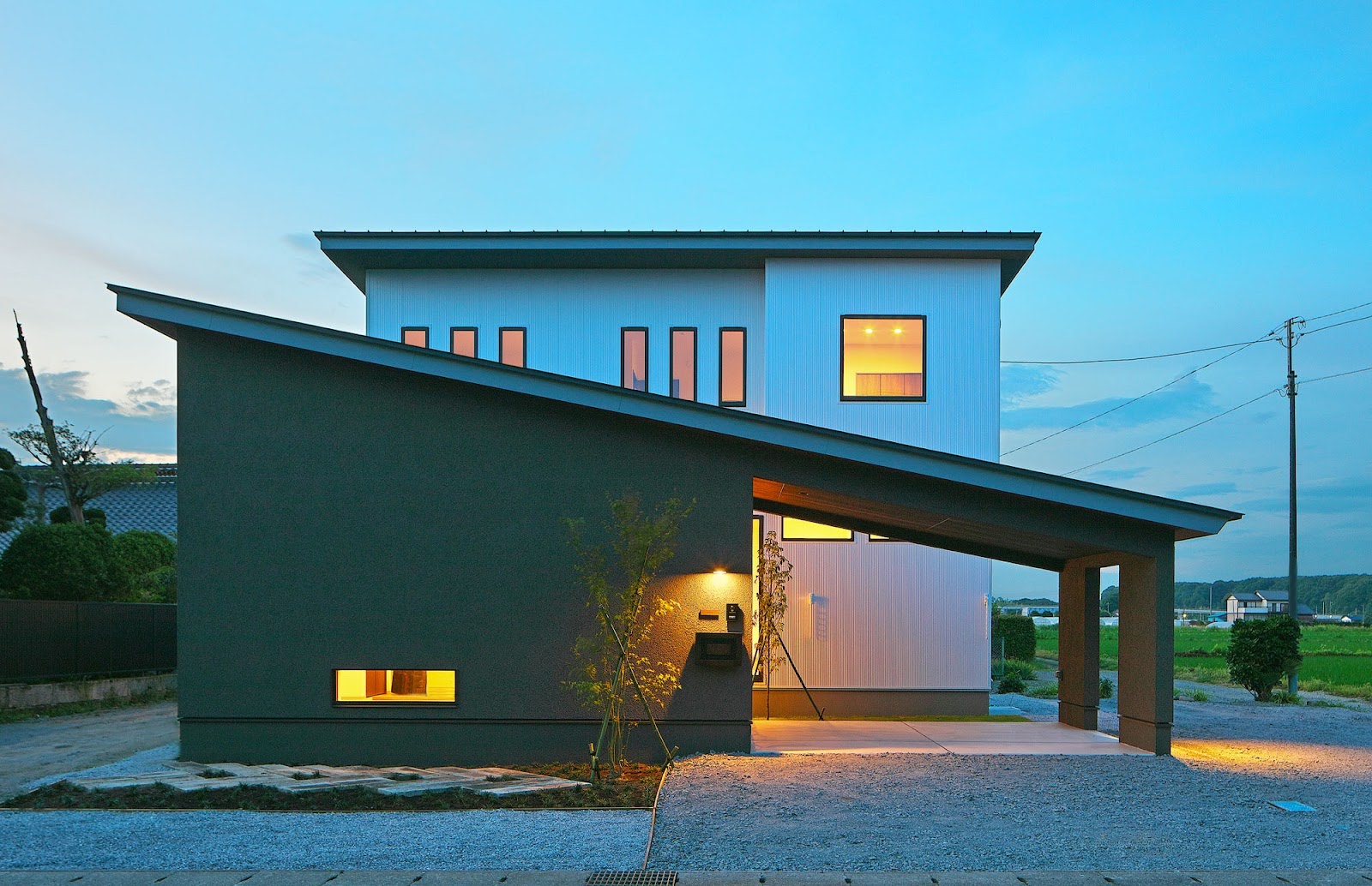2つの建物で構成することによって、リズミカルで個性の際立つ外観の住宅ができる点もまた、家族とリフトを愛する家