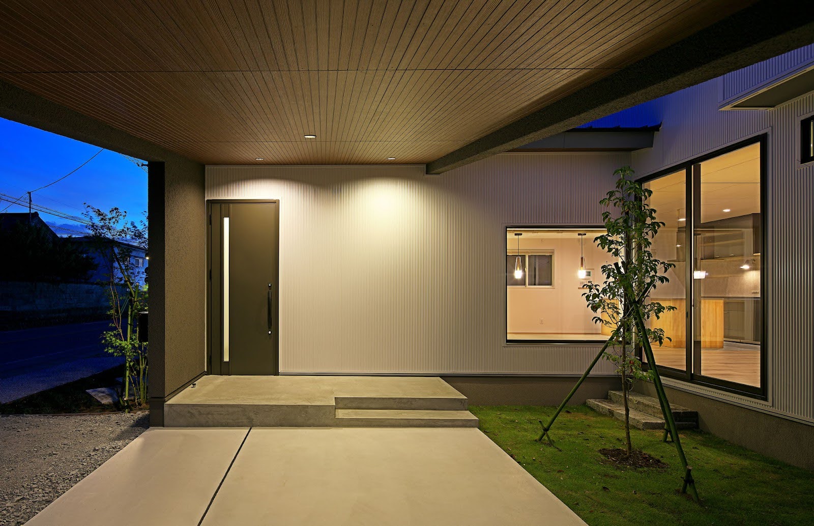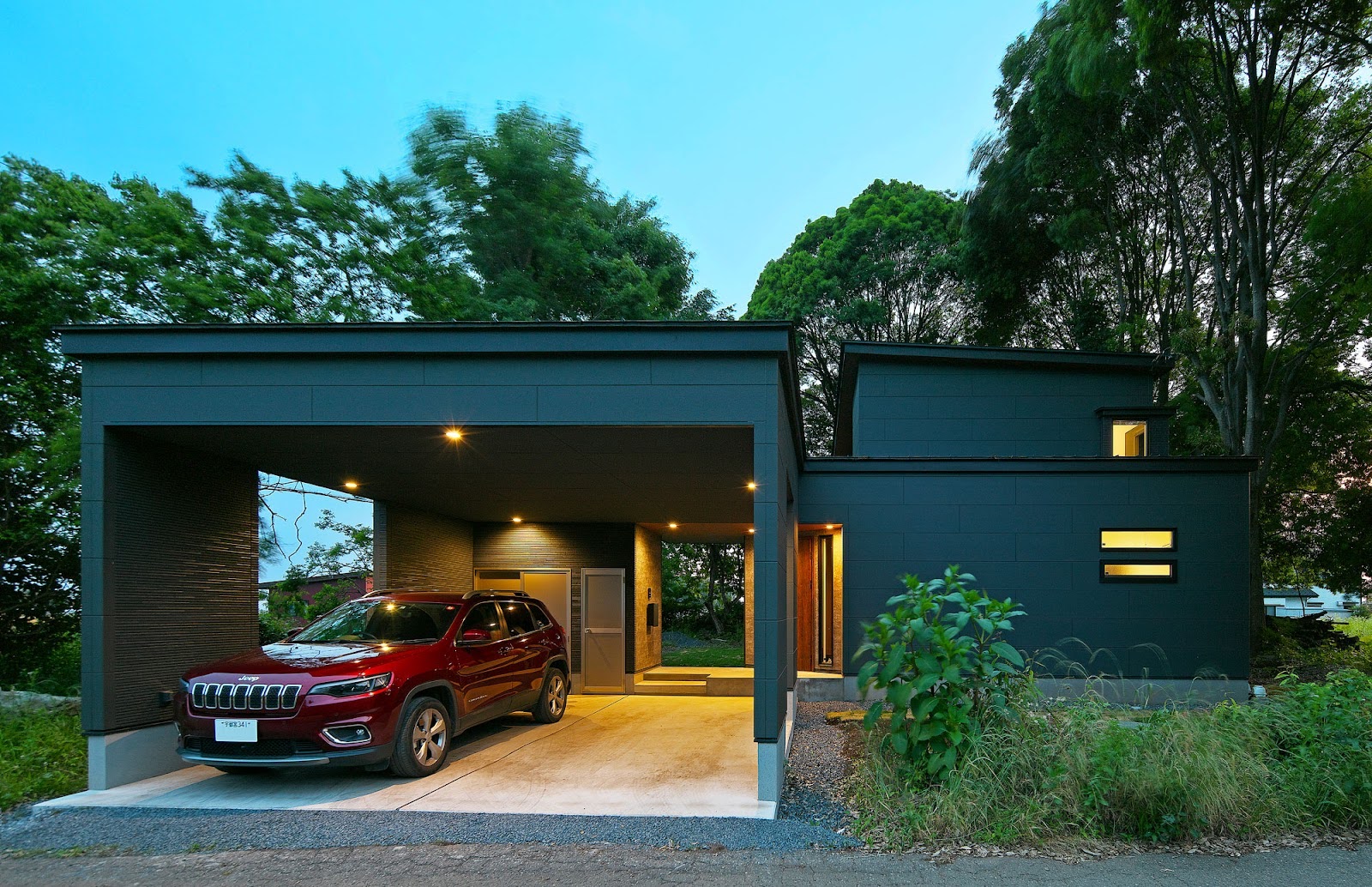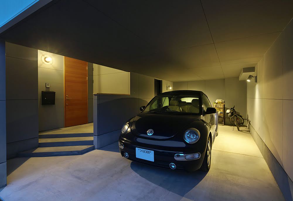駐車スペースの奥にはクルマ用品等の収納スペース、玄関アプローチですので、ライティングにも細心の配慮をしています。
