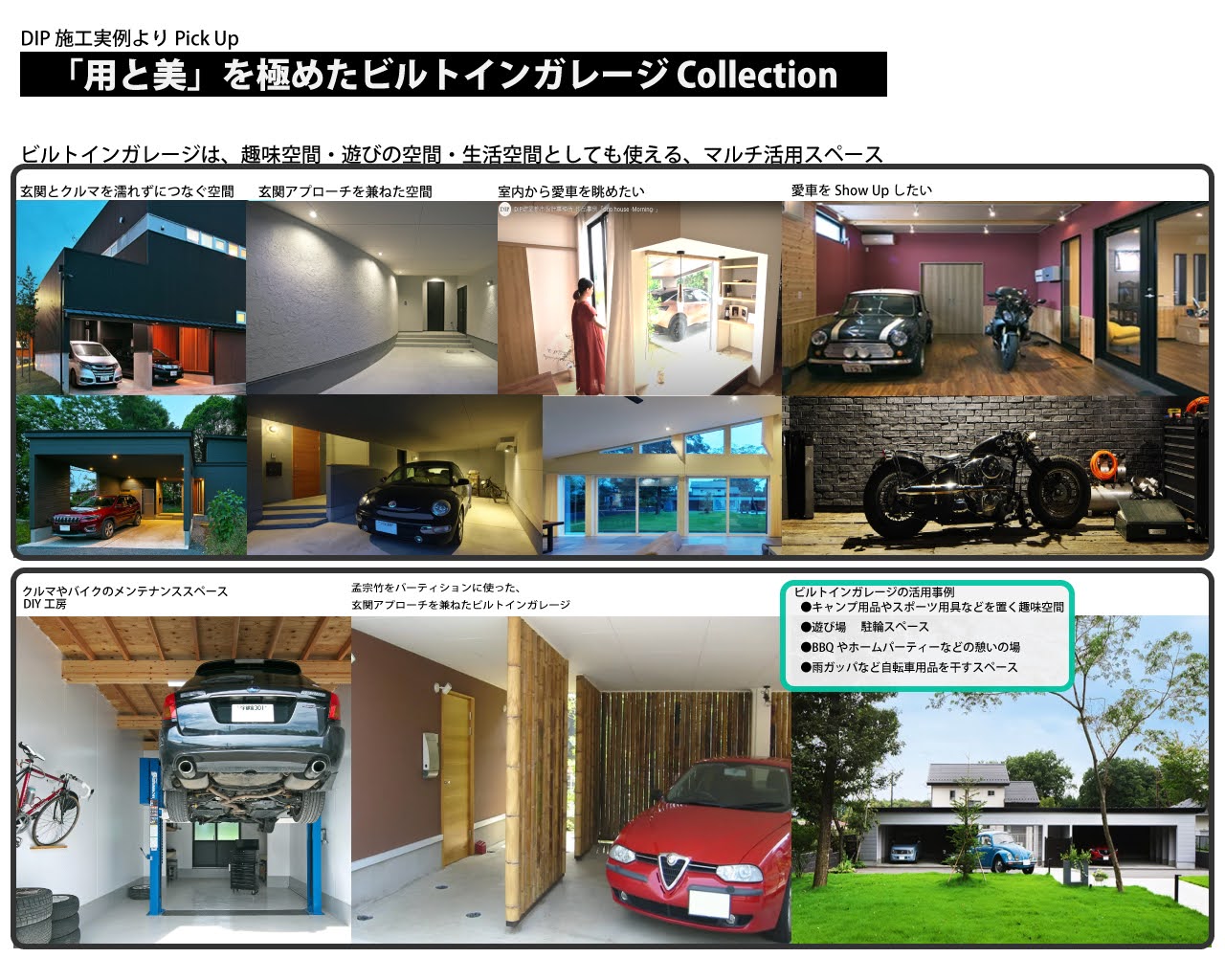 DIPでは「傘を使わないで、玄関に入れるストレスフリーなガレージ」を少なくとも1台分は確保するように提案します。