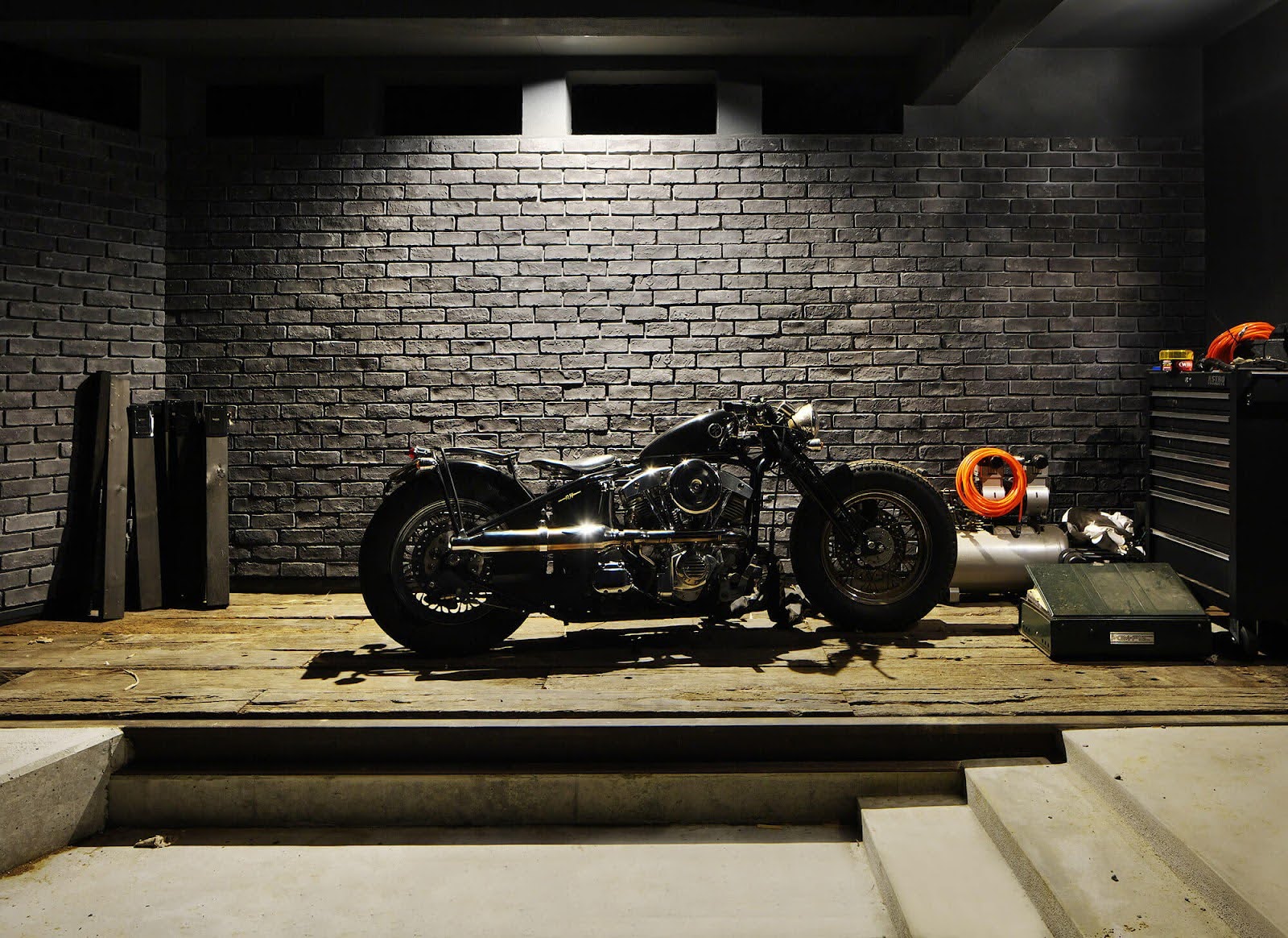 2-7.ドラマチックなライティングとレンガが際立つバイクガレージ