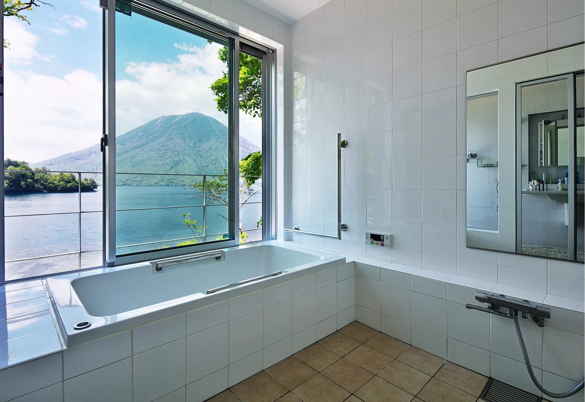 大きな窓から自然の景色が一望できる、開放感あふれるバスルーム。目の前に広がる山々や緑に囲まれた景色が、日常のストレスをそっと解きほぐしてくれます。バスタブの位置も工夫されていて、入浴中も美しい眺めを楽しめる贅沢な設計。自然と調和するバスルームは、まさに理想的な癒しの空間です。