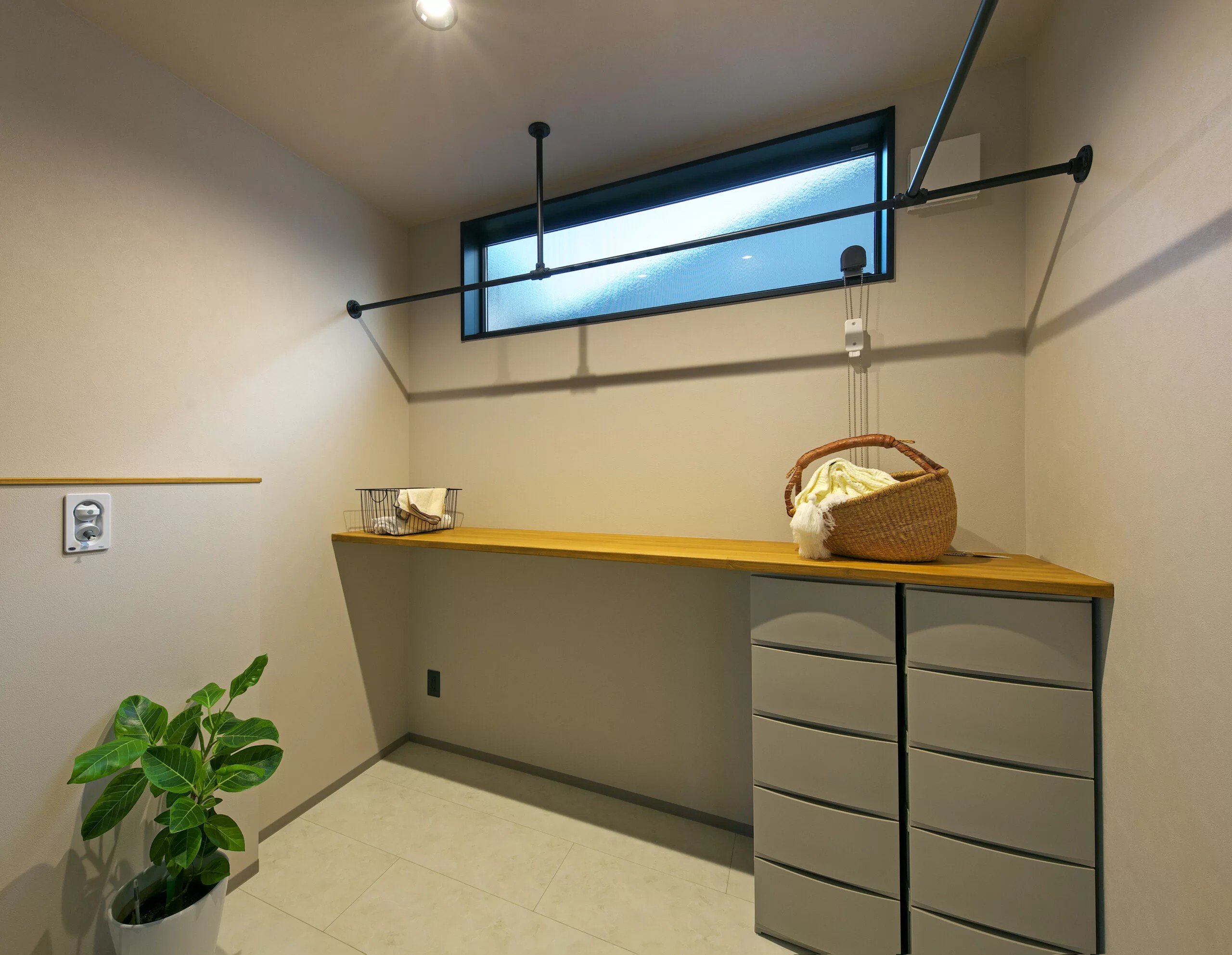 ランドリールームは家族構成やライフスタイルによって使い方が変化しやすい場所です。そのため、可動棚を取り入れておくと、収納するアイテムに合わせて高さを自由に調整でき、無駄なく使えます。さらに、カゴやボックスを組み合わせれば、洗濯物の仕分けやストック品の整理が簡単。ナチュラル素材のカゴを選べば、空間に温かみが出ておしゃれさもアップします。