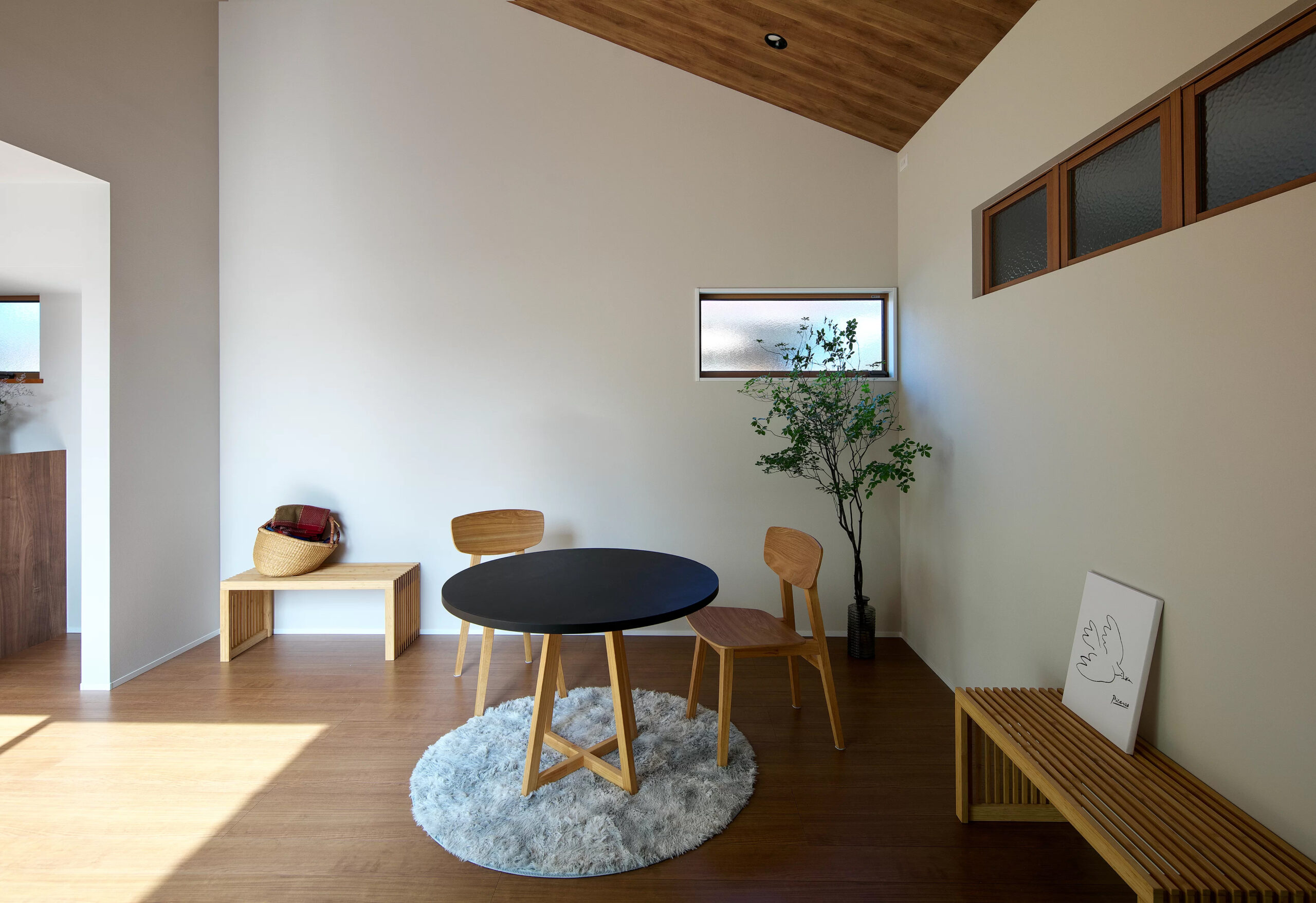 明るい木目の床と白い壁を基調としたリビングに、デザイン性と機能性を兼ね備えた北欧家具が温もりを添えています。特に、ユニークなデザインの低めのテーブルやチェアーは、空間を広く見せる効果もあり、日本の住宅にも馴染みやすいのが魅力です。柔らかな色合いのラグ、そして天井付近の木製の梁が、北欧スタイルらしい安らぎを感じさせます。