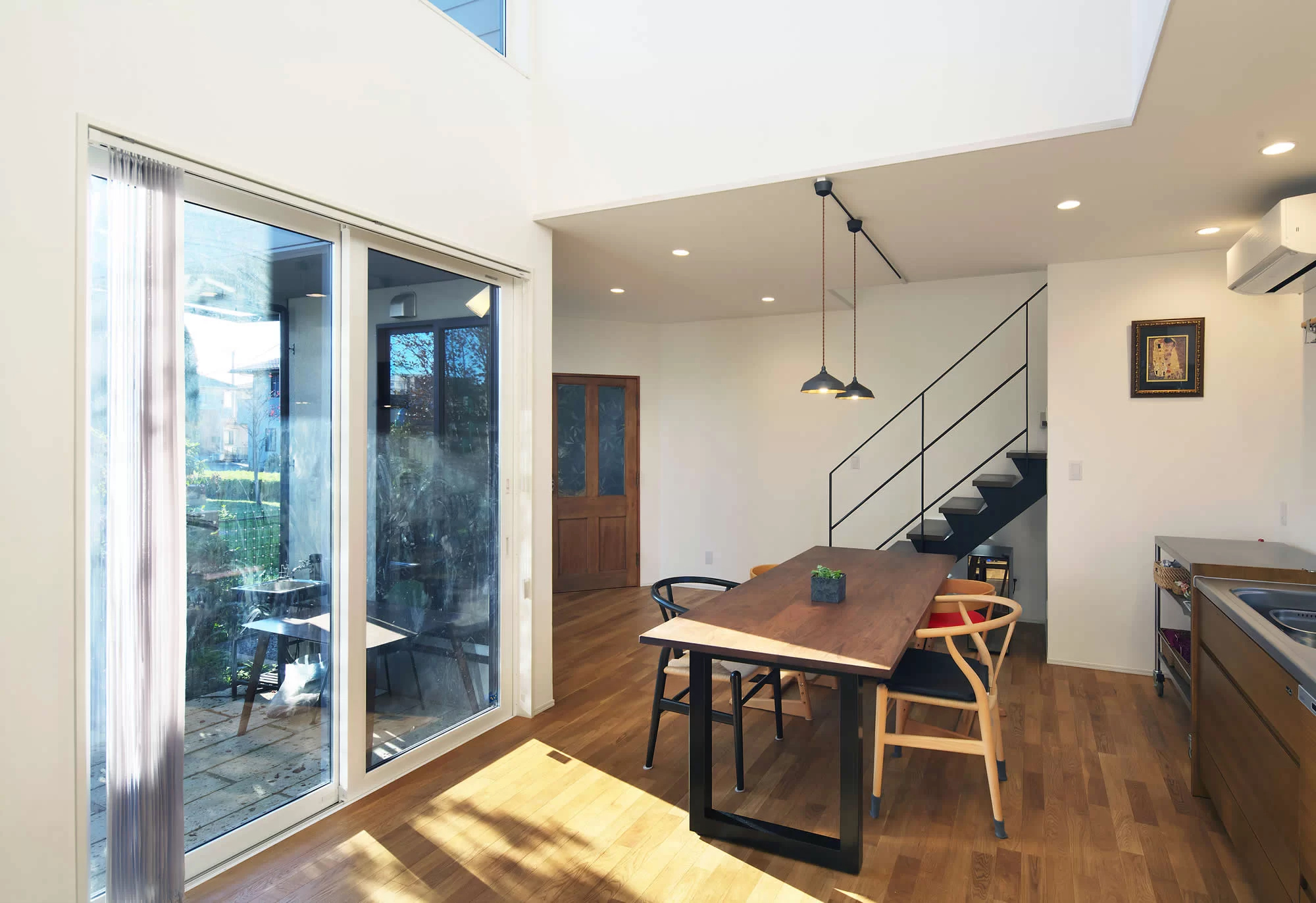 大きな吹き抜け空間に、繊細なブラックのフレームが美しいスケルトン階段を配置した事例です。背面の大きな窓から差し込む光を遮ることなく、まるでオブジェのように空間に溶け込んでいます。視界を遮るものがないため、リビングのどこにいても家族の気配を感じられる、開放感あふれる住まいを実現しています。